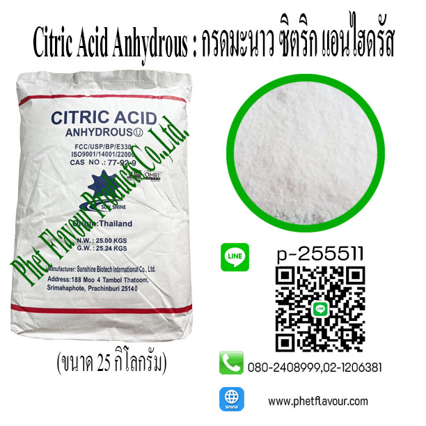 เป็นกรดมะนาว ชนิดไม่มีโมเลกุลของน้ำ ในสูตรอาหาร การให้รสชาติ และความเปรี้ยวนั่น เหมาะที่จะนำไปใช้ ในอุตสาหกรรมอาหารและเครื่องดื่ม เพื่อให้อาหารและเครื่องดื่มชนิดนั่นๆมีรสเปรี้ยว เหมือนกับรสมะนาว