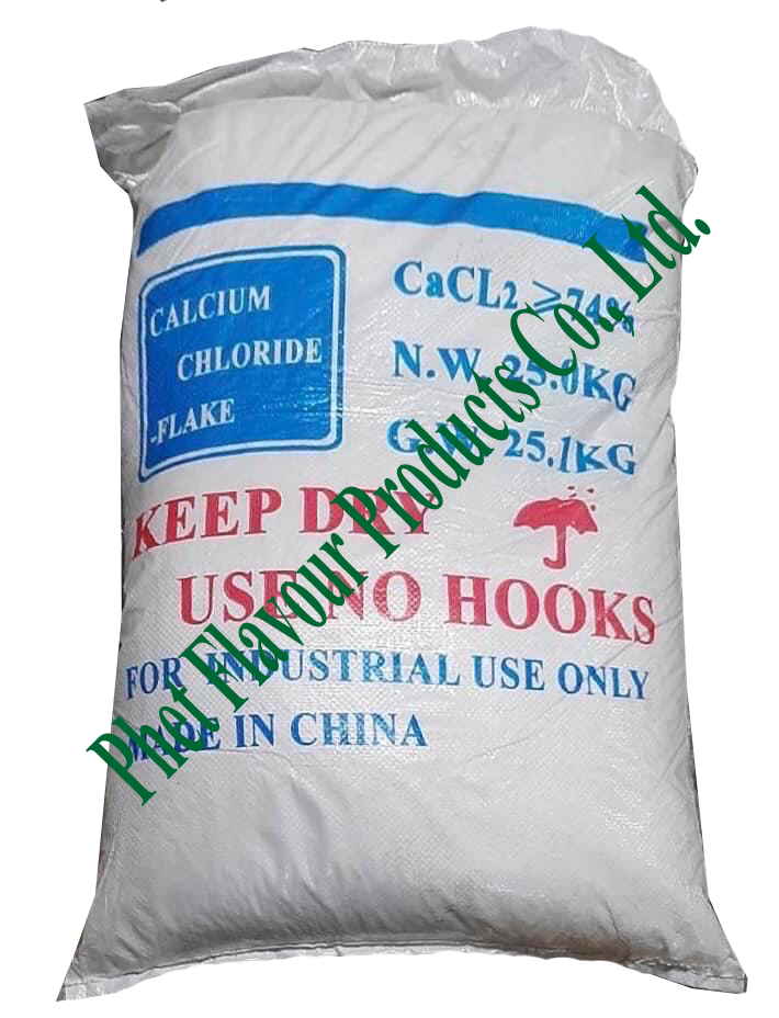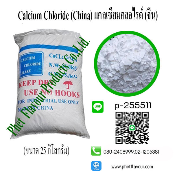 Calcium Chloride (China) เกลือแคลเซียมคลอไรด์ในรูปที่ปราศจากน้ำละลายได้ในน้ำประมาณ 59 กรัมต่อน้ำ 100 มิลลิลิตร ที่อุณหภูมิ 0 องศาเซลเซียส ขณะละลายจะคายความร้อนออกมาด้วย ส่วนเกลือแคลเซียมคลอไรด์ที่มีน้ำ 2 โมเลกุล (ไดไฮเดรต) ละลายได้ดีในน้ำประมาณ 97 กรัมต่อน้ำ 100 มิลลิลิตร ที่อุณหภูมิ 0 องศาเซลเซียส แคลเซียมคลอไรด์ใช้ประโยชน์เป็นสารเติมแต่งอาหารและเป็นสารช่วยให้ผักและผลไม้มีเนื้อสัมผัสแข็ง (firming agent) นิยมใช้กับผลไม้ก่อนนำไป บรรจุกระป๋อง เช่น ลิ้นจี่ ลำไย แอปเปิล มะเขือเทศ และมันฝรั่ง ที่ความเข้มข้นไม่เกิน 1 เปอร์เซ็นต์ การใช้ปริมาณแคลเซียมคลอไรด์มากหรือน้อยจะขึ้นอยู่กับปริมาณเพกทินที่มีอยู่ในผักและผลไม้ชนิดนั้นๆ
