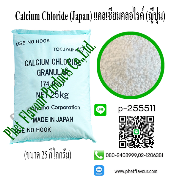 Calcium Chloride (Japan) เกลือแคลเซียมคลอไรด์ในรูปที่ปราศจากน้ำละลายได้ในน้ำประมาณ 59 กรัมต่อน้ำ 100 มิลลิลิตร ที่อุณหภูมิ 0 องศาเซลเซียส ขณะละลายจะคายความร้อนออกมาด้วย ส่วนเกลือแคลเซียมคลอไรด์ที่มีน้ำ 2 โมเลกุล (ไดไฮเดรต) ละลายได้ดีในน้ำประมาณ 97 กรัมต่อน้ำ 100 มิลลิลิตร ที่อุณหภูมิ 0 องศาเซลเซียส แคลเซียมคลอไรด์ใช้ประโยชน์เป็นสารเติมแต่งอาหารและเป็นสารช่วยให้ผักและผลไม้มีเนื้อสัมผัสแข็ง (firming agent) นิยมใช้กับผลไม้ก่อนนำไป บรรจุกระป๋อง เช่น ลิ้นจี่ ลำไย แอปเปิล มะเขือเทศ และมันฝรั่ง ที่ความเข้มข้นไม่เกิน 1 เปอร์เซ็นต์ การใช้ปริมาณแคลเซียมคลอไรด์มากหรือน้อยจะขึ้นอยู่กับปริมาณเพกทินที่มีอยู่ในผักและผลไม้ชนิดนั้นๆ