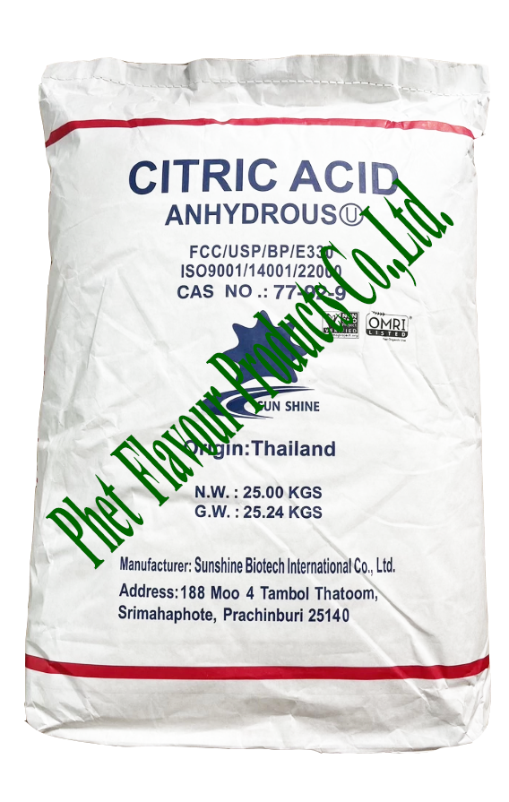 เป็นกรดมะนาว ชนิดไม่มีโมเลกุลของน้ำ ในสูตรอาหาร การให้รสชาติ และความเปรี้ยวนั่น เหมาะที่จะนำไปใช้ ในอุตสาหกรรมอาหารและเครื่องดื่ม เพื่อให้อาหารและเครื่องดื่มชนิดนั่นๆมีรสเปรี้ยว เหมือนกับรสมะนาว การใช้ในอาหาร กรดซิตริก เป็นวัตถุเจอปนอาหาร (Food Additive) ที่ใช้อย่างกว้างขวางในอาหาร และเครื่องดื่ม