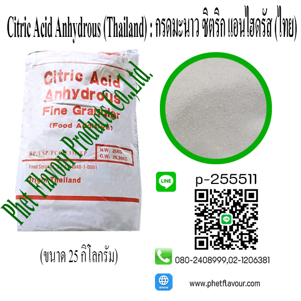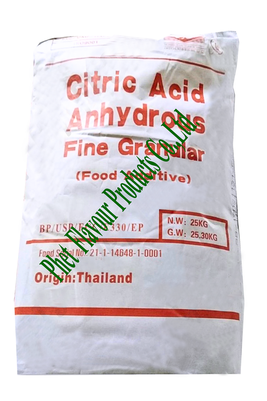 เป็นกรดมะนาว ชนิดไม่มีโมเลกุลของน้ำ ในสูตรอาหาร การให้รสชาติ และความเปรี้ยวนั่น เหมาะที่จะนำไปใช้ ในอุตสาหกรรมอาหารและเครื่องดื่ม เพื่อให้อาหารและเครื่องดื่มชนิดนั่นๆมีรสเปรี้ยว เหมือนกับรสมะนาว การใช้ในอาหาร กรดซิตริก เป็นวัตถุเจอปนอาหาร (Food Additive) ที่ใช้อย่างกว้างขวางในอาหาร และเครื่องดื่ม