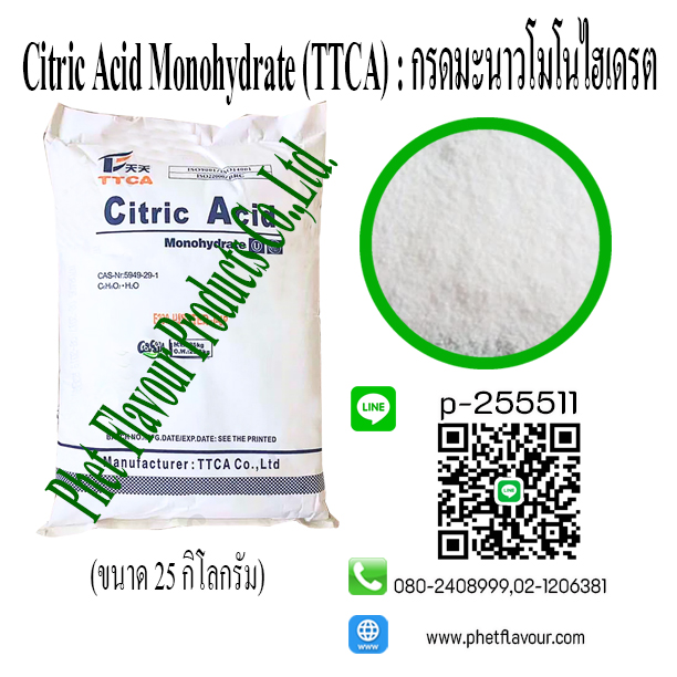 Citric Acid Monohydrate (กรดมะนาว โมโนไฮเดรต) สารให้ความเปรียว ให้รสเปรี้ยว อ่อนกว่า ชนิด Anhydrous แต่จะมีราคาถูกกว่า